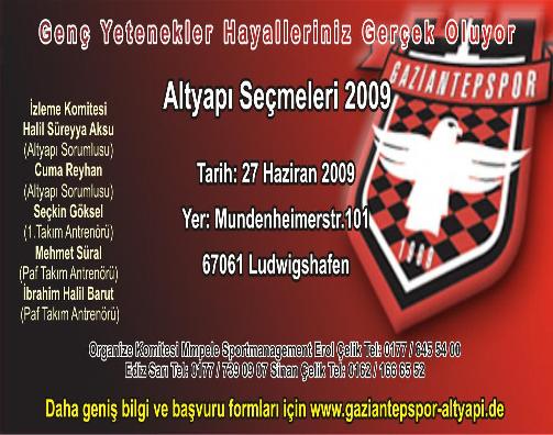 23-25 Haziran tarihlerinde Gazi Şehrimizde yapılacak olan Gaziantepspor Altyapı Seçmeleri 27 Haziran Tarihi'nde sizlere çok yakın bir yerde Almanya'nın Ludwigshafen kentinde hemde Gaziantep'teki seçmeleri yapan komite tarafından yapılacaktır.Benzerlerinden tamamen farklı bir zihniyetle gerçekleştirilecek olan seçmelere hepsi birbirinden değerli spor adamları katılacaklardır.
